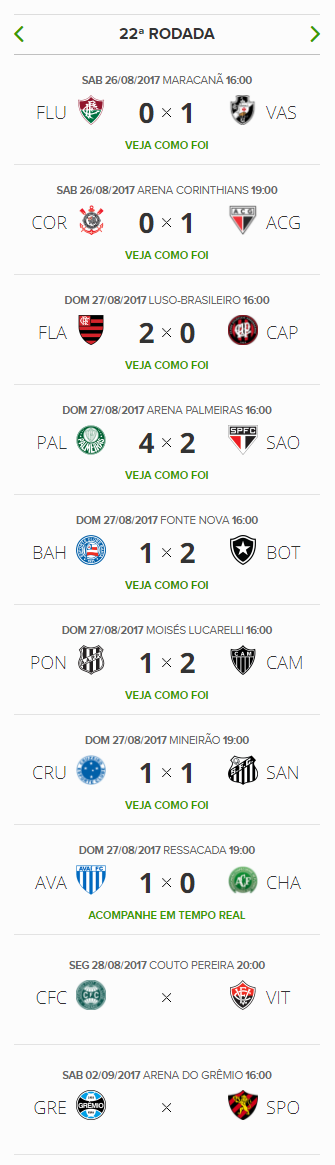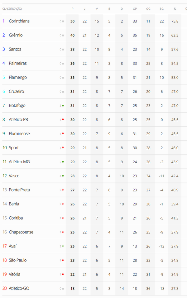 Terminados os jogos deste fim de semana pela 22ª rodada do Brasileiro, o Vasco, que venceu o Fluminense por 1 a 0, subiu da 16ª para a 12ª posição na tabela.