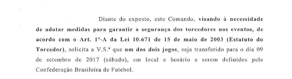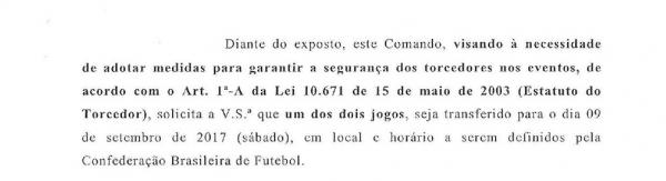 Veja trecho do ofício da Polícia Militar pedindo à CBF antecipação de Vasco x Grêmio
