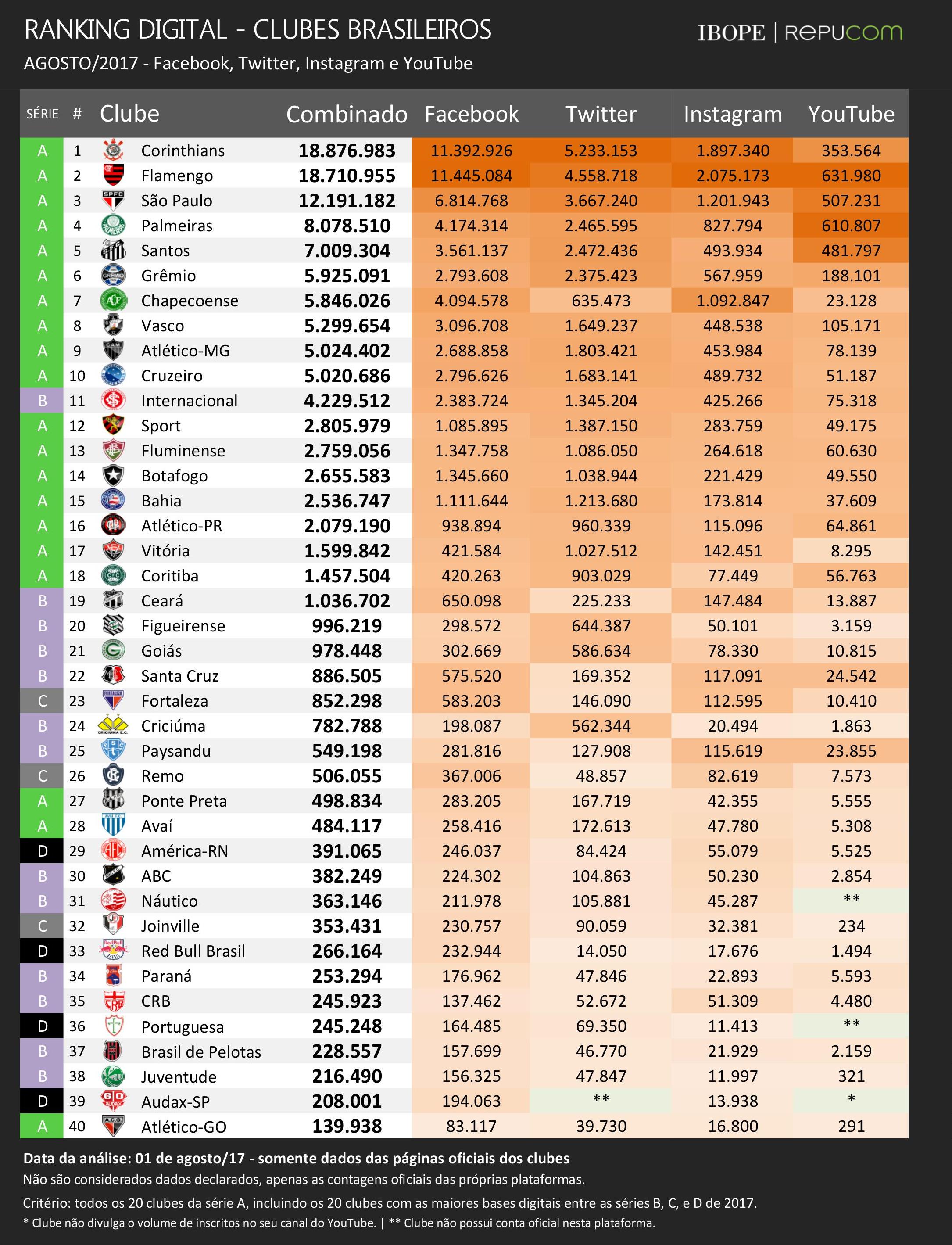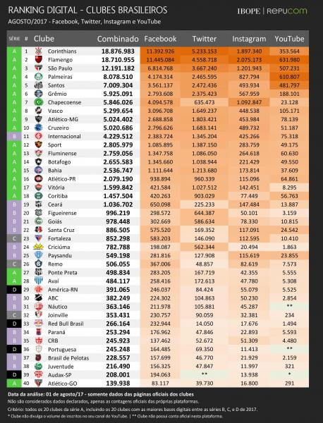 No que depender do atual líder, Corinthians, a disputa será acirrada. O clube paulista, que lidera o ranking desde o início das medições e ostenta a liderança em seguidores no Twitter entre os clubes brasileiros, registrou no último mês seu maior crescimento em 2017, somando 266 mil novos inscritos em suas redes sociais. Com isso, o clube paulista mantém vantagem de 166 mil seguidores para o Flamengo.