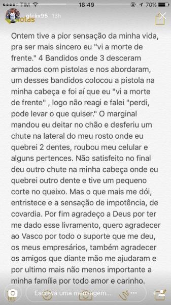 Gabriel Felix relata assalto e agressão e agradece apoio do Vasco