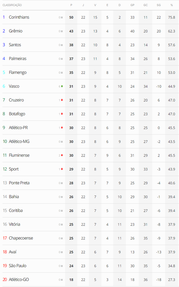 Vasco 'dorme' no G6 após os jogos deste sábado; veja classificação