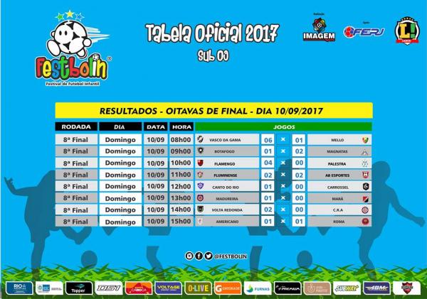 Seguem os resultados dos jogos deste Domingo dia10/09/2017 no Festbolin 2017 na categoria sub-9 válidos pela Oitavas de Final.