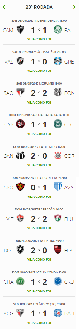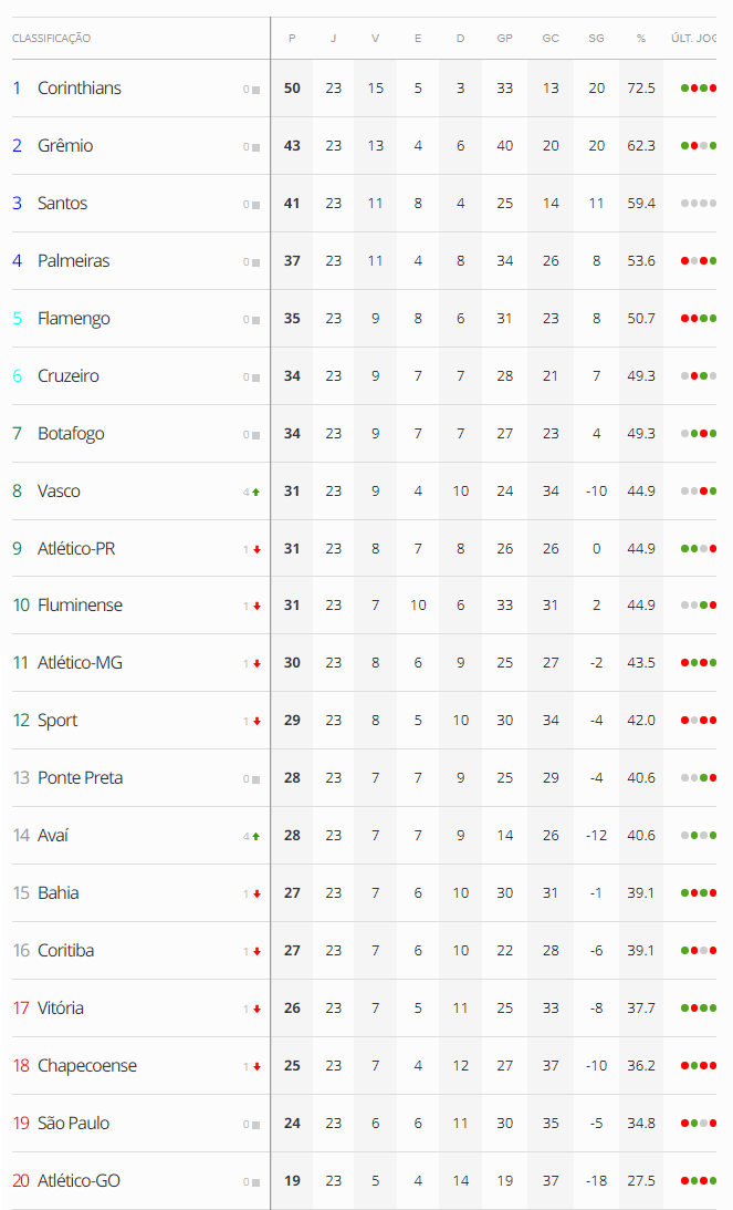 Terminada a 23ª rodada do Brasileiro, o Vasco, que venceu o Grêmio por 1 a 0, subiu da 12ª para a 8ª posição na tabela.