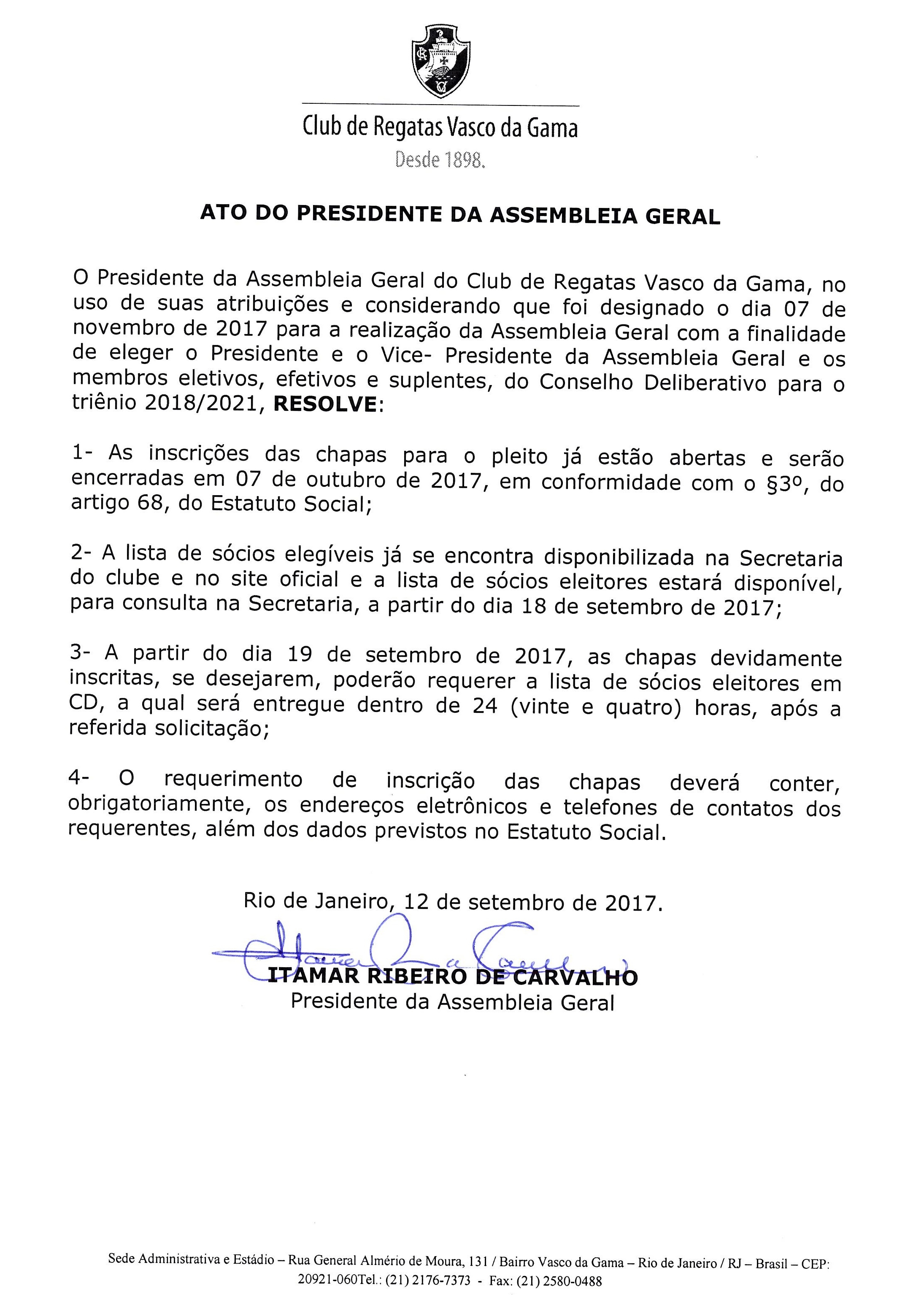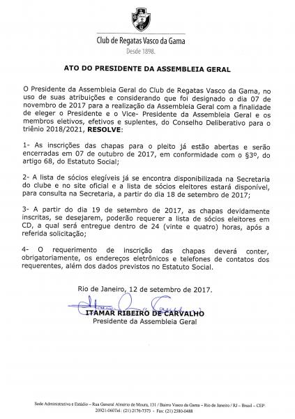 Vasco publica nesta terça ata sobre a data de inscrição das chapas. Candidatos têm até o dia 7 de outubro, um mês antes da eleição. #gevas