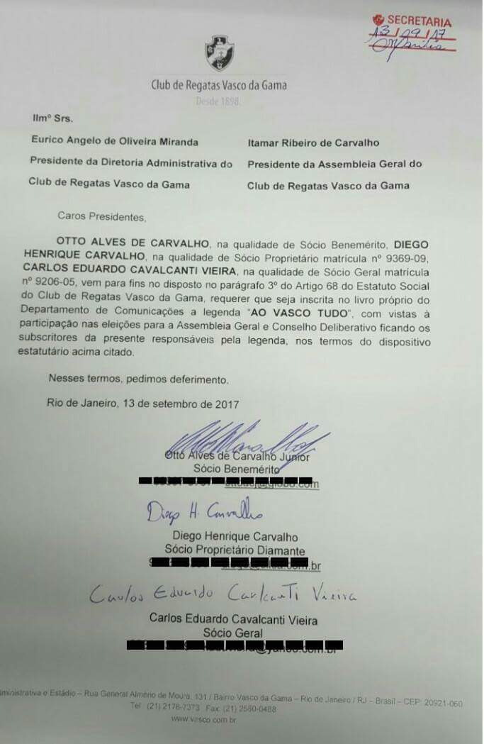 Chapa "Ao Vasco tudo", de @OttoCarvalhojr, foi registrada há pouco para a eleição de novembro no Vasco #lanceVAS