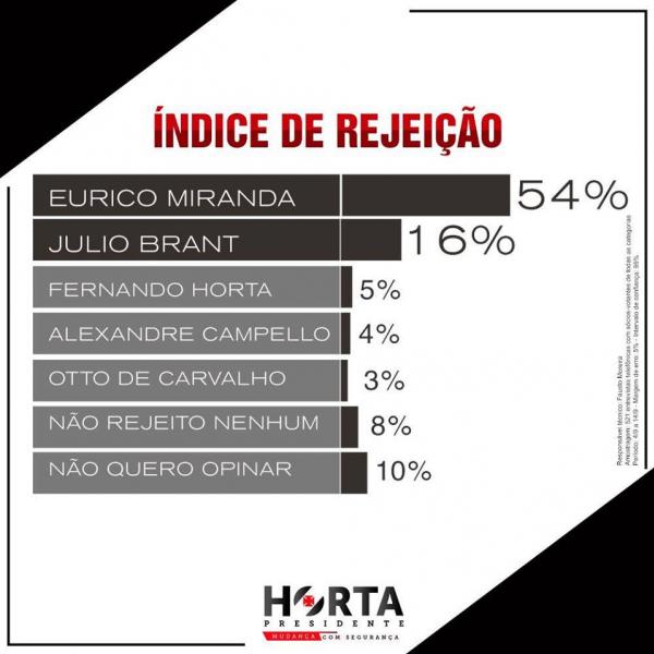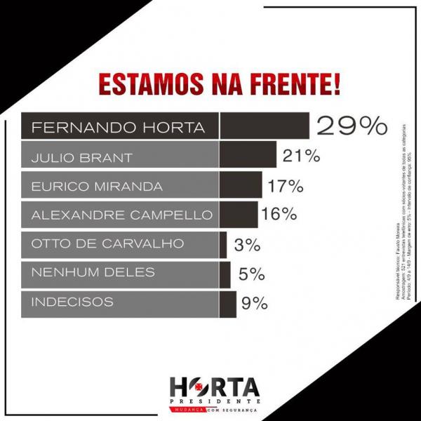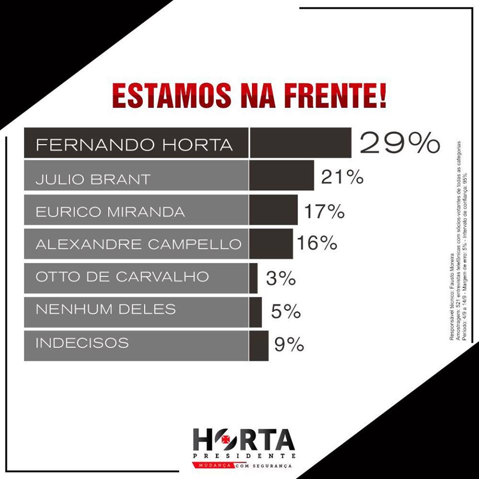 Na primeira pesquisa oficial de uma campanha nas eleições do Vasco deste ano, iniciada no dia 4/9 e finalizada em 14/9, Horta aparece em primeiro lugar disparado e mostra um ritmo de crescimento acelerado quando comparado aos estudos iniciais feitos antes do lançamento da campanha.