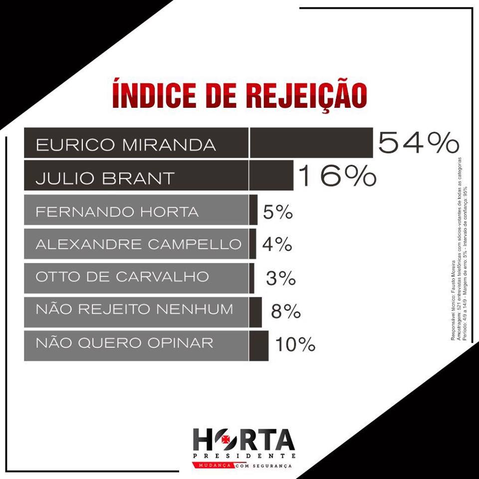 Em pesquisa dirigida pelo pesquisador Fausto Moreira, o mesmo profissional que acertou o resultado das eleições do Vasco de 2014, agora contratado oficialmente pela campanha de Fernando Horta para realizar as pesquisas quantitativas e qualitativas que guiarão nosso candidato nos próximos meses, foi possível observar a rejeição maior dos sócios ao atual presidente, Eurico Miranda.