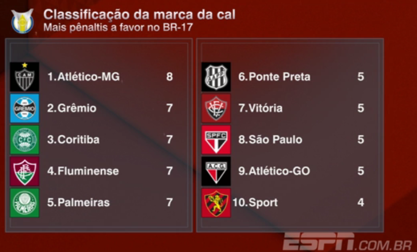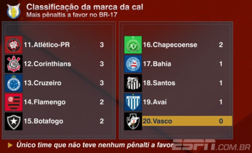 Levantamento feito pela ESPN mostra que o Vasco é o único clube do Brasileiro 2017 (que já está em sua 24ª rodada) a não ter tido nenhum pênalti marcado a seu favor, seguindo "invicto" na competição nesse quesito.
