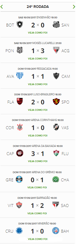 Terminados os jogos deste domingo da 24ª rodada do Brasileiro, o Vasco, que perdeu para o Corinthians por 1 a 0, caiu da 8ª para a 9ª posição na tabela.