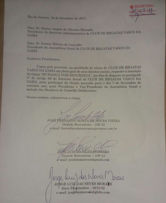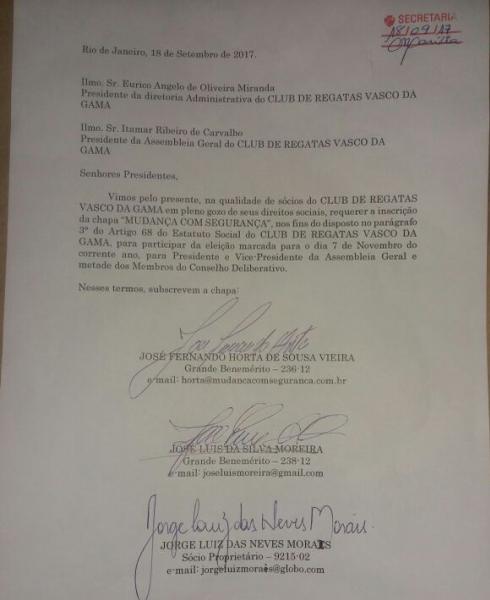 O candidato Fernando Horta inscreveu nesta segunda-feira sua chapa "Mudança com Segurança" para a eleição presidencial do Vasco, dia 7 de novembro. Também assina o pedido José Luiz Moreira, outro ex-aliado de Eurico Miranda.