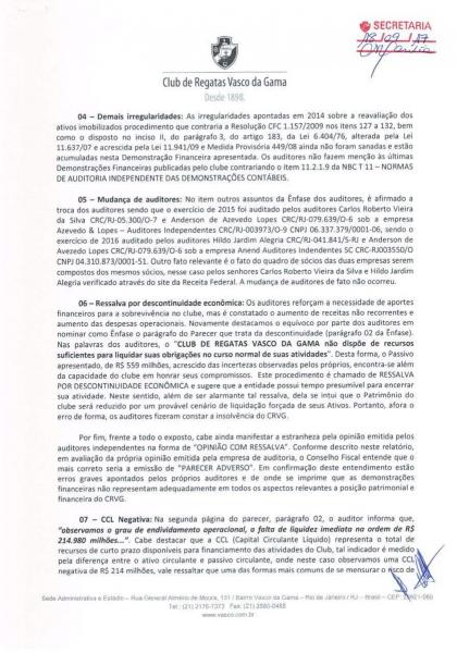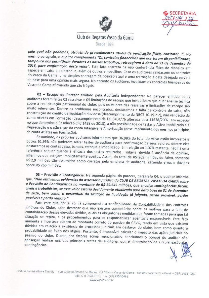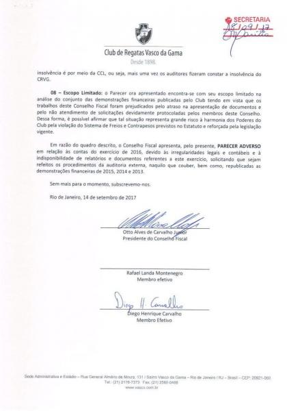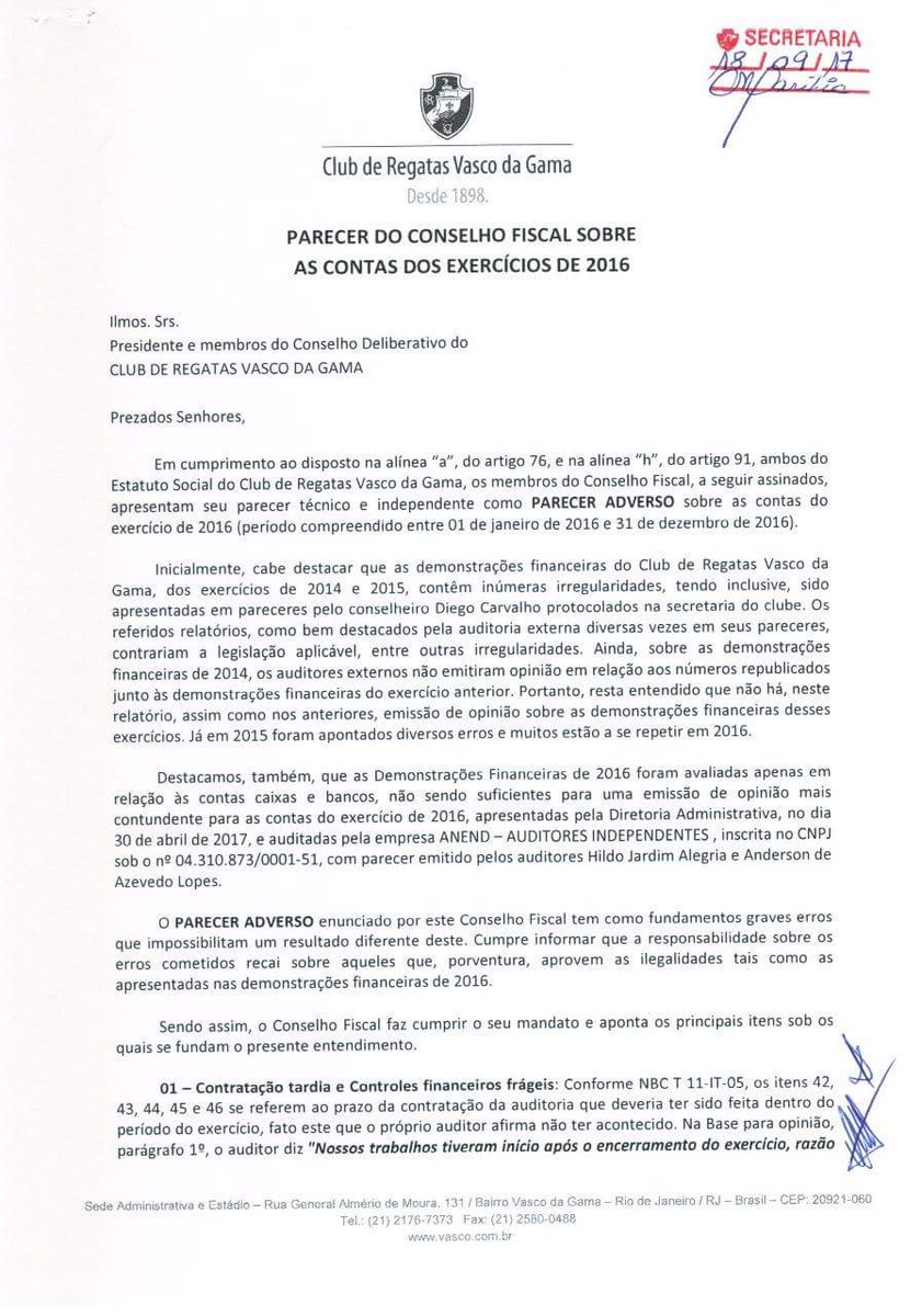 Conselho Fiscal do Vasco protocolou na secretaria do clube na última segunda o parecer recomendando a reprovação das contas 2016 #lanceVAS