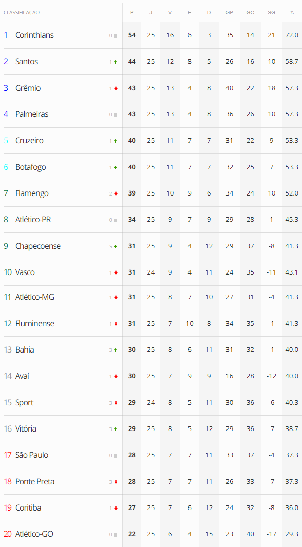 Após os jogos de domingo da 25ª rodada do Campeonato Brasileiro, o Vasco está em 10º lugar na classificação. Se vencer o Sport nesta 2ª-feira, às 20h, na Ilha do Retiro, ultrapassará Chapecoense e Atlético-PR e terminará a rodada na 8ª posição. Se empatar, subirá para a 9ª colocação.