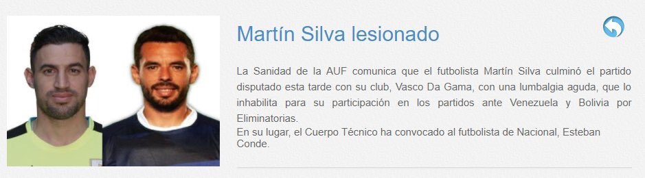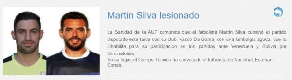 O goleiro vascaíno Martín Silva foi desconvocado da Seleção do Uruguai por causa de uma lesão que sofreu após o jogo Vasco x Chapecoense. Em seu lugar, Esteban Conde foi chamado e já viajou com a delegação uruguaia para a Venezuela.