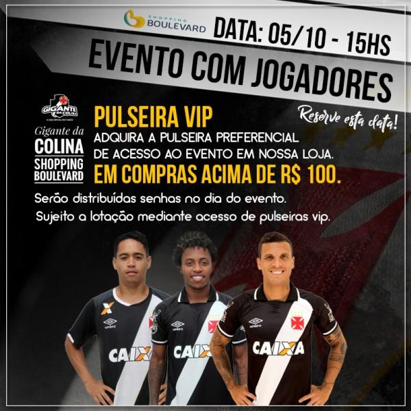 Os lateral-esquerdo Ramon, o meio-campo Yago Pikachu e o atacante Paulo Vitor participarão de uma tarde de fotos e autógrafos na loja Gigante da Colina do Shopping Boulevard (antigo Iguatemi), em Vila Isabel, na próxima quinta-feira (05/10). O evento com os jogadores vascaínos começará às 15 horas.