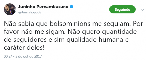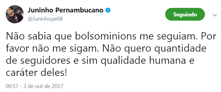 "Por favor não me sigam. Não quero quantidade de seguidores e sim qualidade humana e caráter deles", escreveu o ex-atleta na rede social. "Só pra esclarecer, tô tuitando sem sono 33 mil pés. Assumo tudo que disse e peço, vaza bolsominions. Te respeito fora de meu Twitter! Apenas", continuou o atual comentarista da TV Globo.