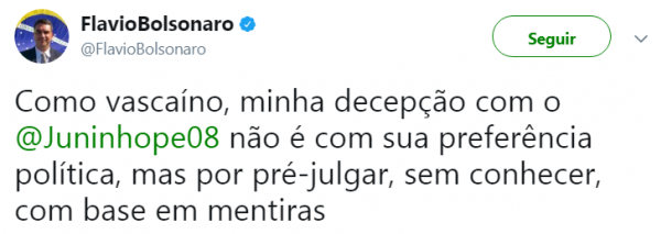 "Como vascaíno, minha decepção com o @Juninhope08 não é com a sua preferência política, mas por pré-julgar, sem conhecer, com base em mentiras", escreveu o político.