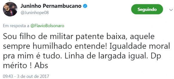 "Sou filho de militar, patente baixa, aquele sempre humilhado entende! Igualdade moral para mim é tudo. Linha de largada igual. Depois mérito! Abraço", escreveu o ex-jogador.