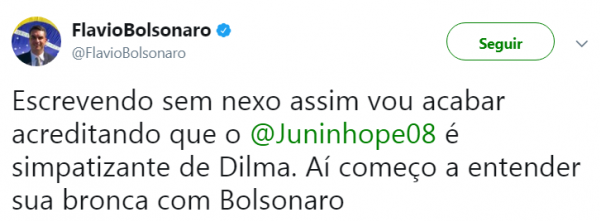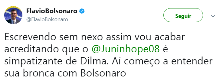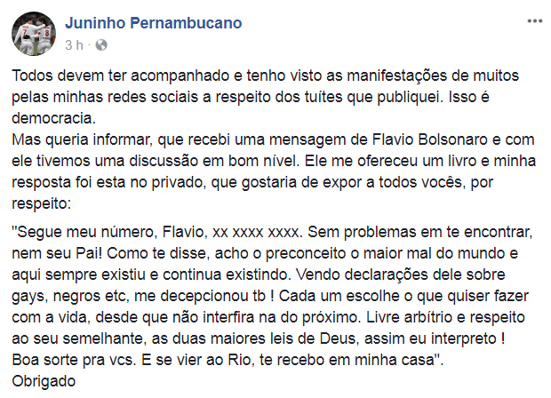 O filho do Jair Bolsonaro, o deputado estadual Flavio, resolveu entrar na discussão e bateu boca com Pernambucano na mesma rede social. O político se disse decepcionado com a postura do ex-meia.