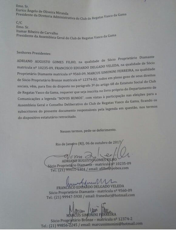Além de Eurico, outro candidato a presidente do Vasco inscreveu chapa nesta sexta: Antônio Miguel Fernandes, da "Novos Rumos". #gevas