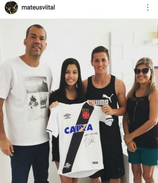 Boa ação: o meia Mateus Vital doou uma camisa do Vasco autografada para ajudar Letícia, torcedora do Flamengo que tem atrofia muscular. A camisa será leiloada para auxiliar no pagamento do tratamento. Antes de Mateus, Letícia havia ganhado uma camisa do Fla das mãos do meia Diego.