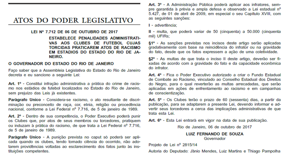 Foi sancionada, pelo governador do Rio de Janeiro, Luiz Fernando Pezão (PMDB), lei que prevê punições aos clubes por atos racistas de seus torcedores nos estádios do estado. O novo código, assinado na sexta-feira, foi publicado no Diário Oficial do Estado desta segunda-feira.