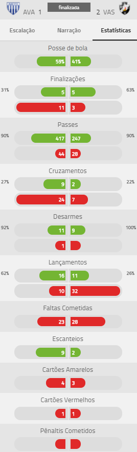 Confira estatísticas de Avaí 1 x 2 Vasco
