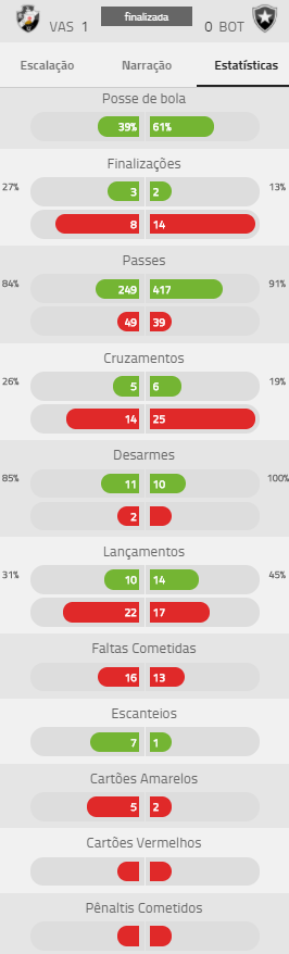 Confira estatísticas de Vasco 1 x 0 Botafogo