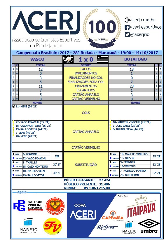 14/10/17 - Maracanã recebeu 31.406 torcedores para Vasco x Botafogo, sendo 27.424 pagantes