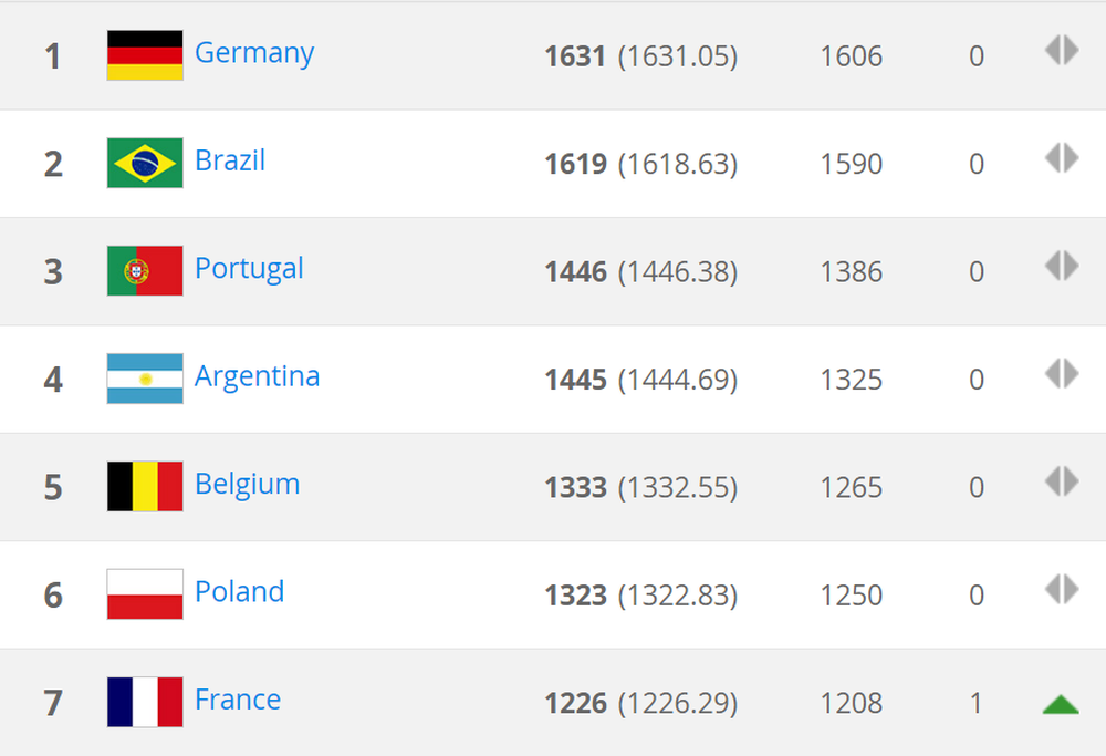 A Fifa divulgou nesta segunda-feira a atualização de outubro do ranking de seleções. Será essa a classificação usada para definir o pote de cada país no sorteio dos grupos da Copa do Mundo da Rússia, marcado para próximo dia 1º de dezembro, em Moscou. A Alemanha puxa a fila dos sete primeiros colocados, que, juntamente com os anfitriões russos, serão os cabeças de chave do Mundial. Além dos atuais campeões, estão garantidos no pote 1 o Brasil, que mantém a segunda colocação, seguido de Portugal, Argentina, Bélgica, Polônia e França.