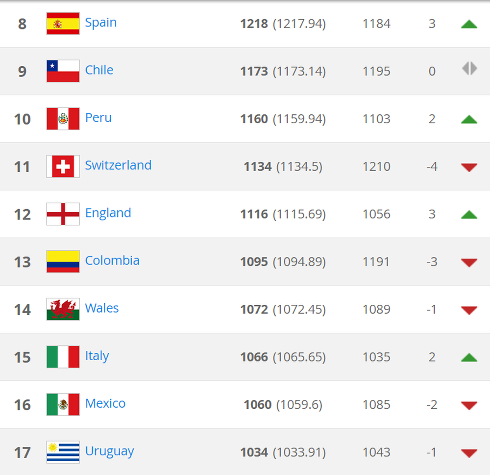 As demais seleções dependem das definições das repescagens, europeias e mundial, e das eliminatórias africanas para conhecerem em quais potes estarão. Com a boa campanha no torneio classificatório sul-americano, o Peru ganhou duas posições no ranking e entrou no Top 10. Caso passe pela Nova Zelândia e garanta a vaga na Copa, Paolo Guerrero e cia. ficarão no pote 2.