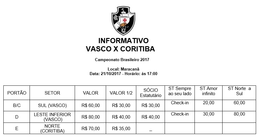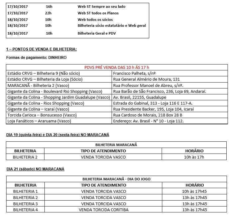 Será realizada na bilheteria da loja de São Januário à partir de 18/10/17, quarta-feira de 10h às 17h, até dia 21/10/17, sábado de 10h às 12h e no Maracanã nos dias 19 e 20/10/17, de 10h às 17h e 21/10/17, sábado (de 10h às 17h).