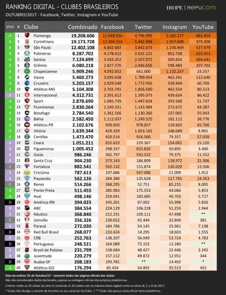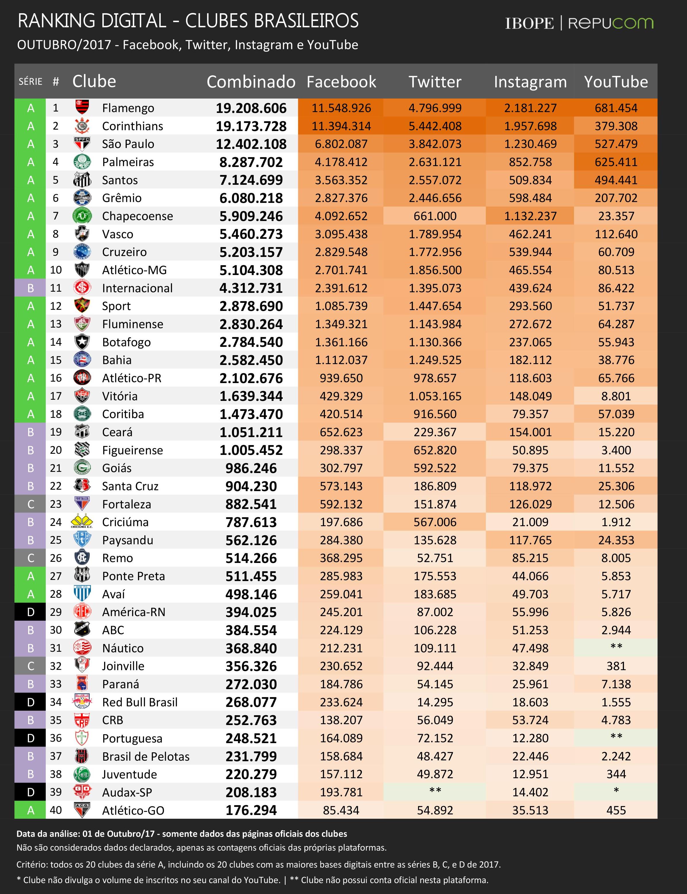 Com o levantamento deste mês, o IBOPE Repucom ressalta a liderança do Flamengo que, na noite de 27 de setembro, desbancou o Corinthians no combinado entre todas as mídias sociais monitoradas. No levantamento atual, o clube carioca já ostenta uma diferença de 35 mil inscrições para o segundo colocado. Até o momento, o clube obteve mais de 2,4 milhões de novos inscritos em suas redes em 2017, uma evolução de 14% em relação ao levantamento de dezembro de 2016.
