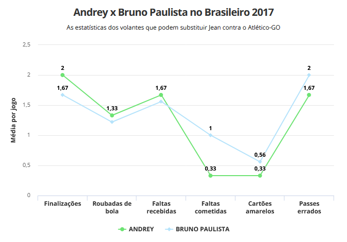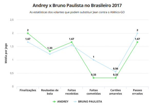 Números de Andrey, na média, são melhores do que os de Bruno Paulista. O primeiro atuou por 160 minutos, sempre saindo do banco, enquanto o segundo jogou 434 - 320 deles como titular.