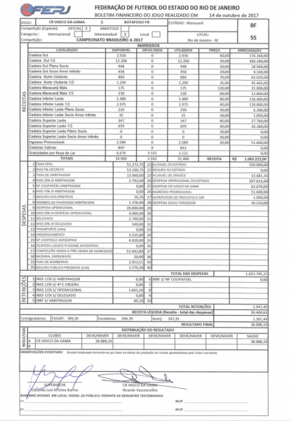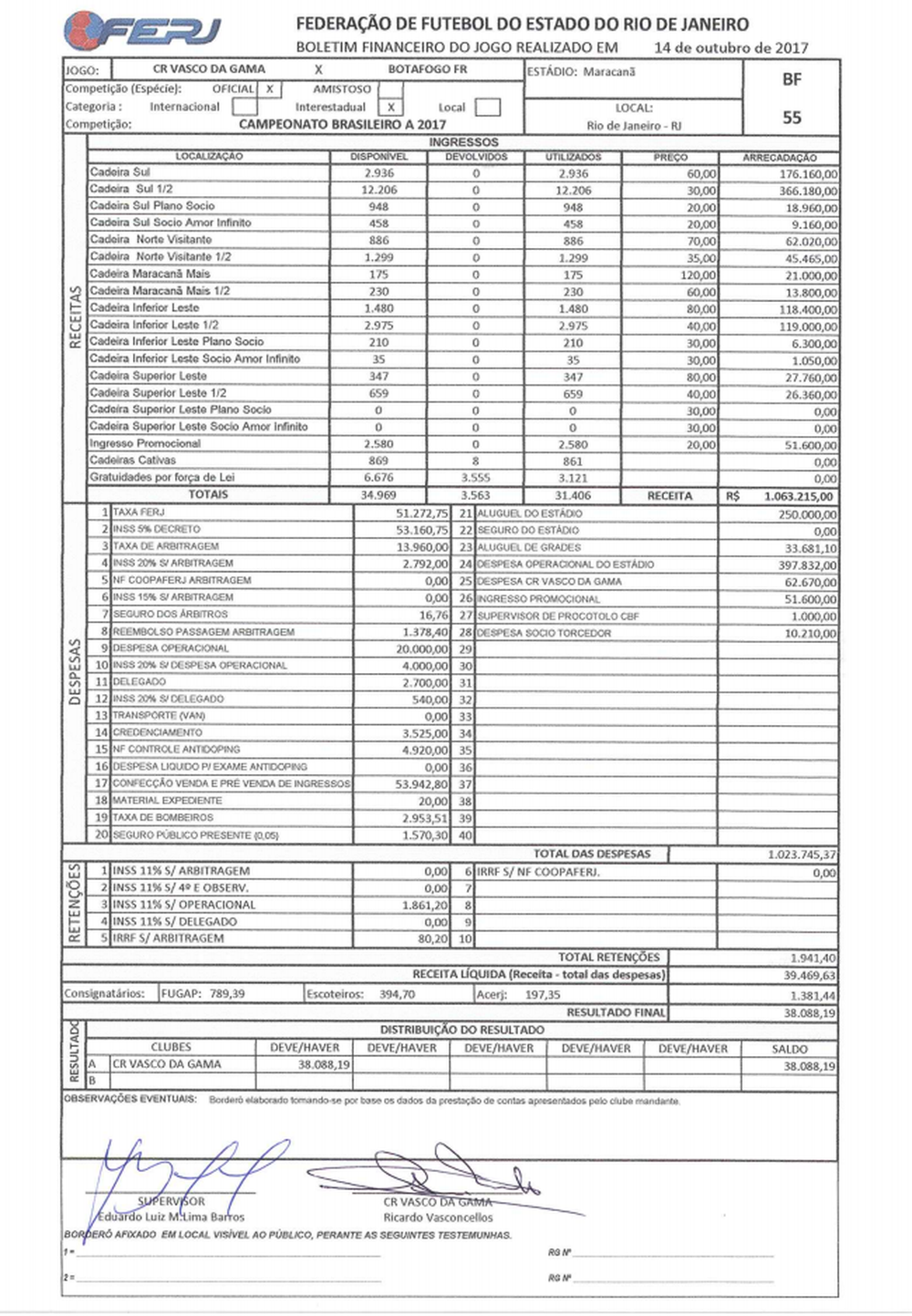 Na vitória por 1 a 0 contra o Botafogo, foram 27.424 pagantes (mais de 31 mil presentes) e uma receita de R$ 1.063.215,00. Porém, com a despesa alta, o Cruz-Maltino, mandante da partida, ficou com apenas R$ 38.088,19. Os principais gastos com os jogos no Maracanã são o aluguel do estádio, no valor de R$ 250 mil, e a despesa operacional, próxima a R$ 400 mil (veja todos os números abaixo).