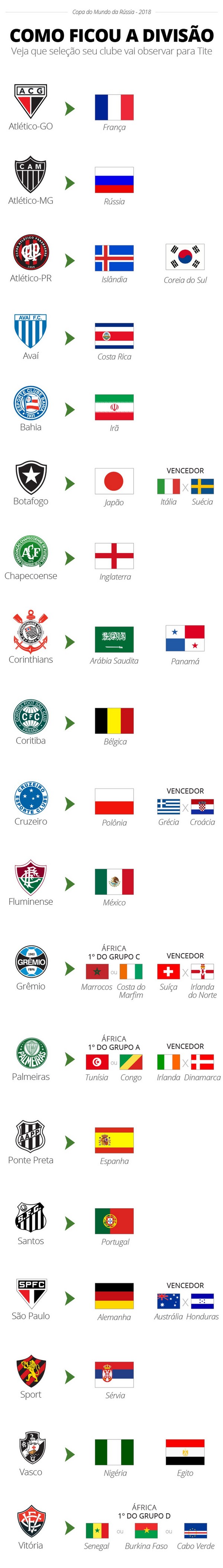 Tite terá a ajuda de 19 clubes da Série A do Campeonato Brasileiro na preparação do Brasil para a Copa do Mundo. A CBF definiu, por meio de um sorteio, quais seleções os analistas de desempenho dos times vão acompanhar daqui até o torneio, que terá início em junho de 2018, na Rússia. O Flamengo foi o único que não pôde participar.