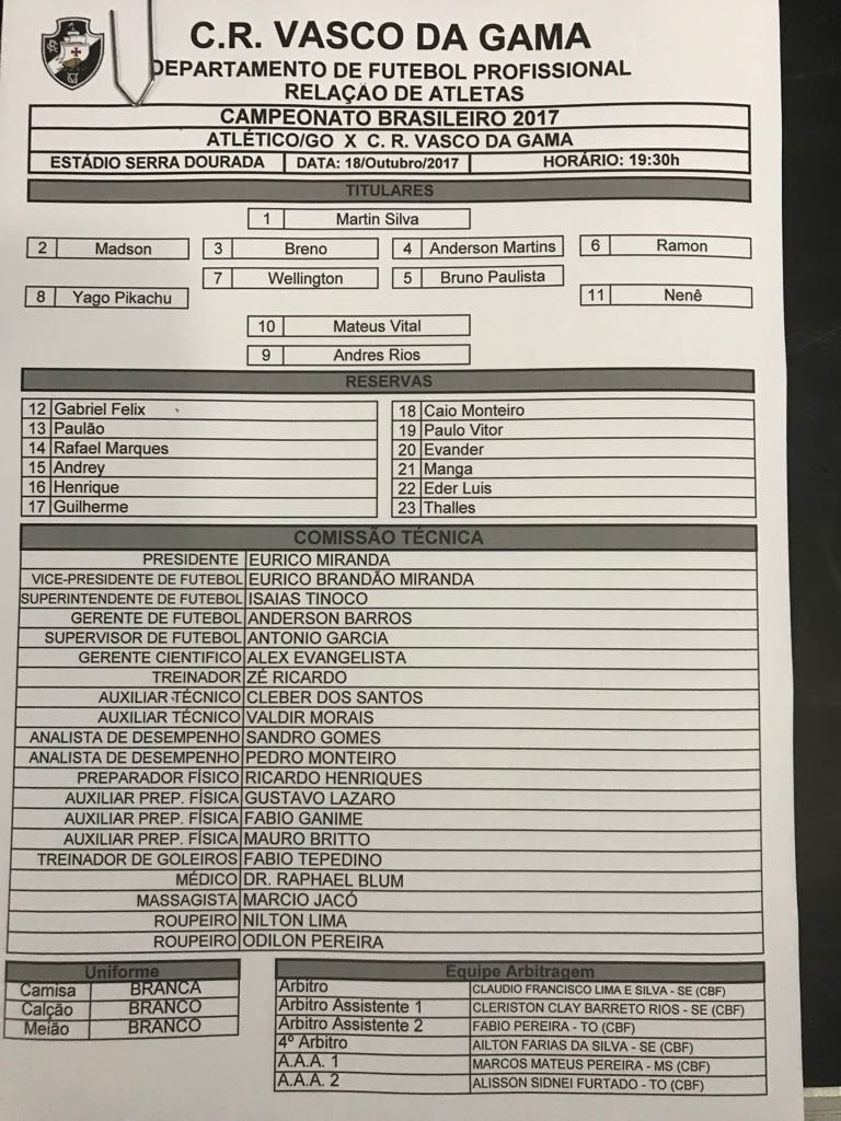 Confira a escalação do Vasco: