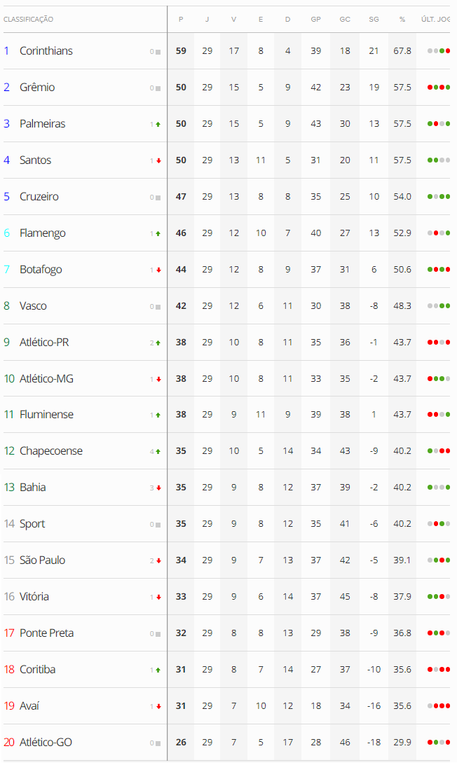 Terminada a 29ª rodada do Brasileiro, o Vasco, que venceu o Atlético-GO por 1 a 0, manteve-se na 8ª posição na tabela.