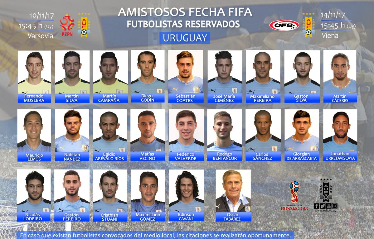 A lista conta com a notável ausência do atacante Luis Suárez, do Barcelona. A Associação Uruguaia de Futebol (AUF) soltou um comunicado para explicar o motivo do camisa 9 não ter sido chamado.