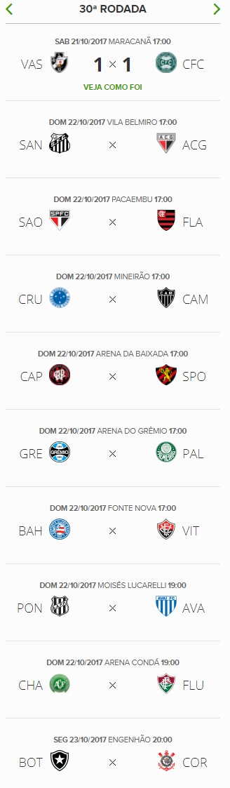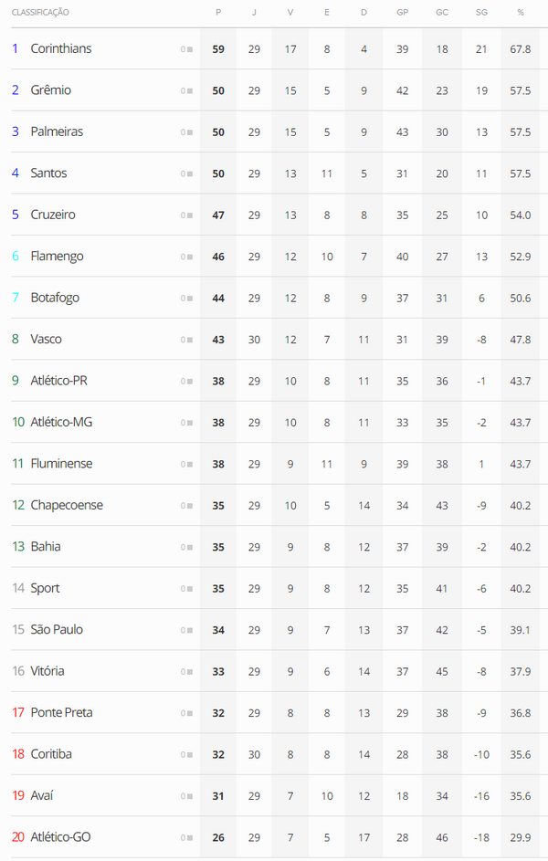Vasco e Coritiba fizeram jogo isolado neste sábado. O Vasco segue na 8ª colocação e não a perderá até o fim da rodada. O Gigante da Colina ficará, na pior das hipóteses (caso o Botafogo e Flamengo vençam), 4 pontos atrás do G7 e, na melhor das hipóteses (caso Botafogo e Flamengo percam), a 1 ponto do G7.
