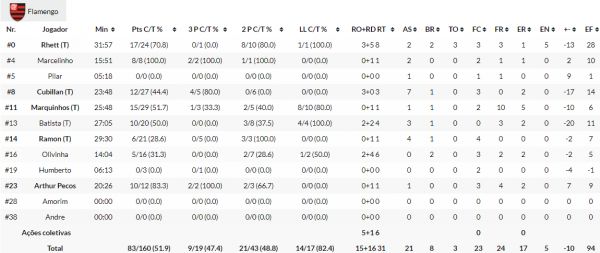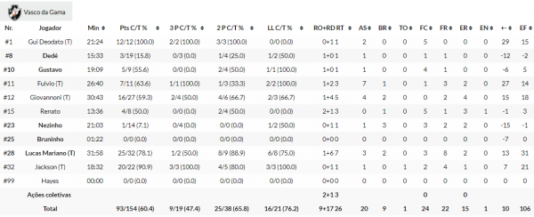 No primeiro tempo, a dupla Fúlvio-Lucas Mariano fez estrago. Principalmente no primeiro quarto, os atletas vascaínos da Seleção Brasileira mostraram o porquê de suas convocações e dominaram o duelo com o Rubro Negro. O Gigante chegou a abrir na etapa inicial 21 pontos de vantagem sobre o clube da Gávea e fechou com 15 na frente: primeiro quarto finalizou em 21 a 14 e o segundo 47 a 32.