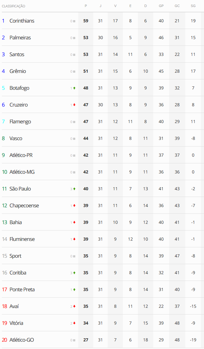 Após o empate com o Flamengo no sábado e os resultados deste domingo, o Vasco segue na 8ª colocação do Campeonato Brasileiro. O Gigante da Colina está a 3 pontos do G7. O G6 "virou" G7 porque o Cruzeiro, campeão da Copa do Brasil, está no G6.