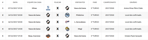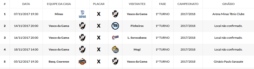 O Vasco estreia na próxima terça-feira (07/11) no NBB 10, contra o Minas, em Minas Gerais. Confira abaixo os 5 primeiros jogos do Gigante da Colina na competição: