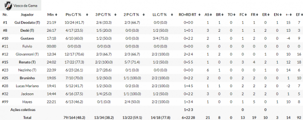 No último período, a qualidade de Guilherme Giovannoni sobressaiu. Com duas bolas de três seguidas, o Vasco conseguiu respirar um pouco no jogo que estava bastante disputado. O armador Nezinho também se destacou no período. O Gigante acertou a marcação e, com infiltrações de Deodato, chegou a ampliar a vantagem para 14 pontos. Depois de administrar o tempo de bola e o placar, o jogo terminou 79-65 para o Vasco.