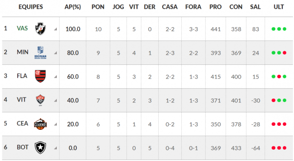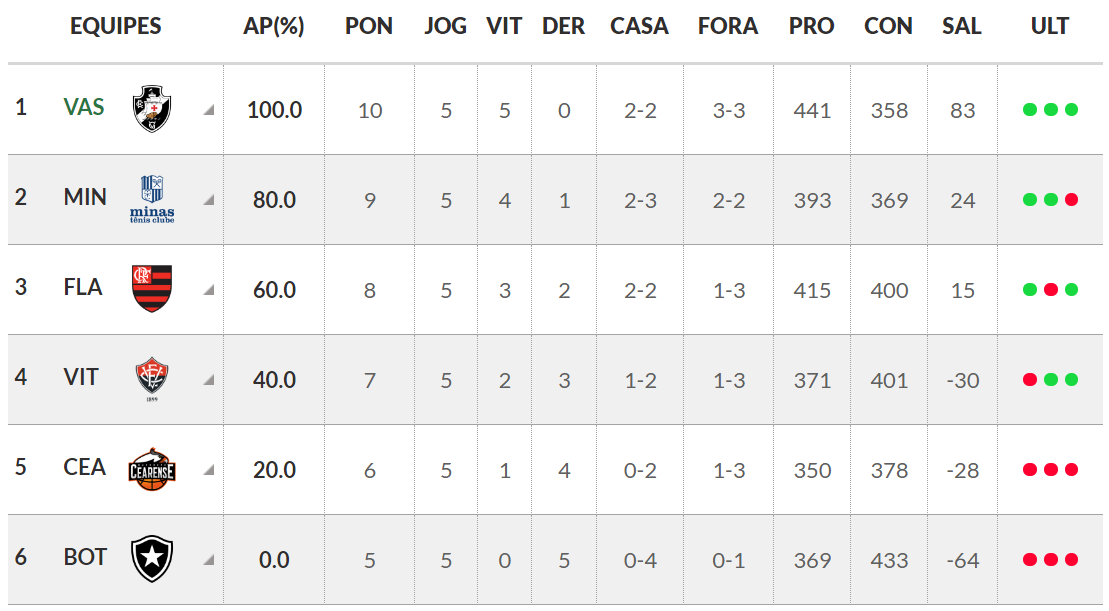 O Gigante do Basquete terminoua fase regular do torneio com cinco vitórias em cinco jogos.