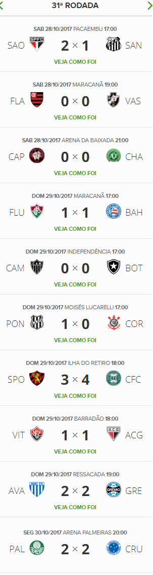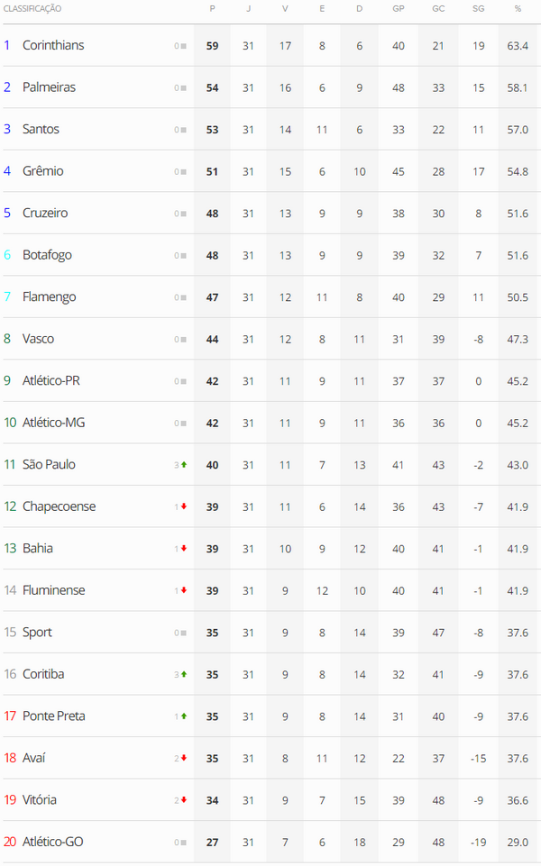 Terminada a 31ª rodada do Brasileiro, o Vasco, que empatou com o Flamengo por 0 a 0, segue na 8ª posição na tabela.