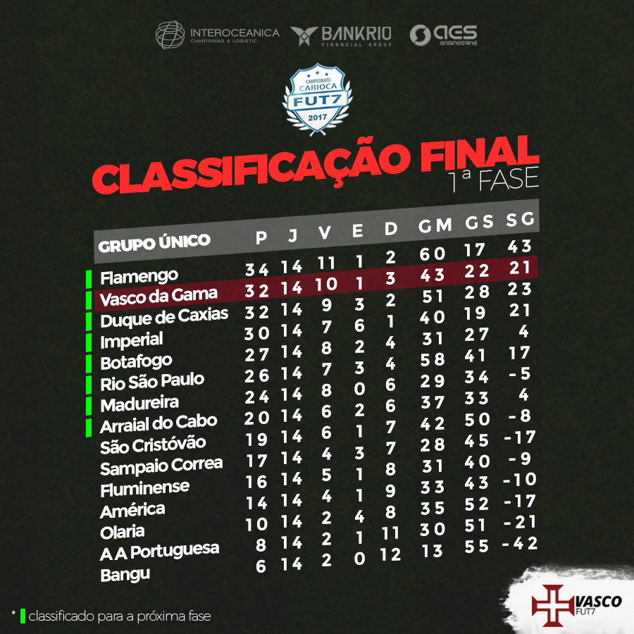 25/10/17 - Futebol 7: Após a derrota no fim de semana, Vasco cai para 2º lugar no Carioca; veja classificação