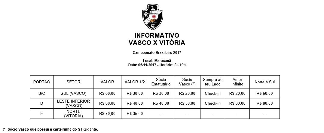 Para os SÓCIOS VASCO com a carteirinha do ST Gigante, os benefícios / regras aplicadas serão as mesmas referente ao PLANO AMOR INFINITO SOCIAL.