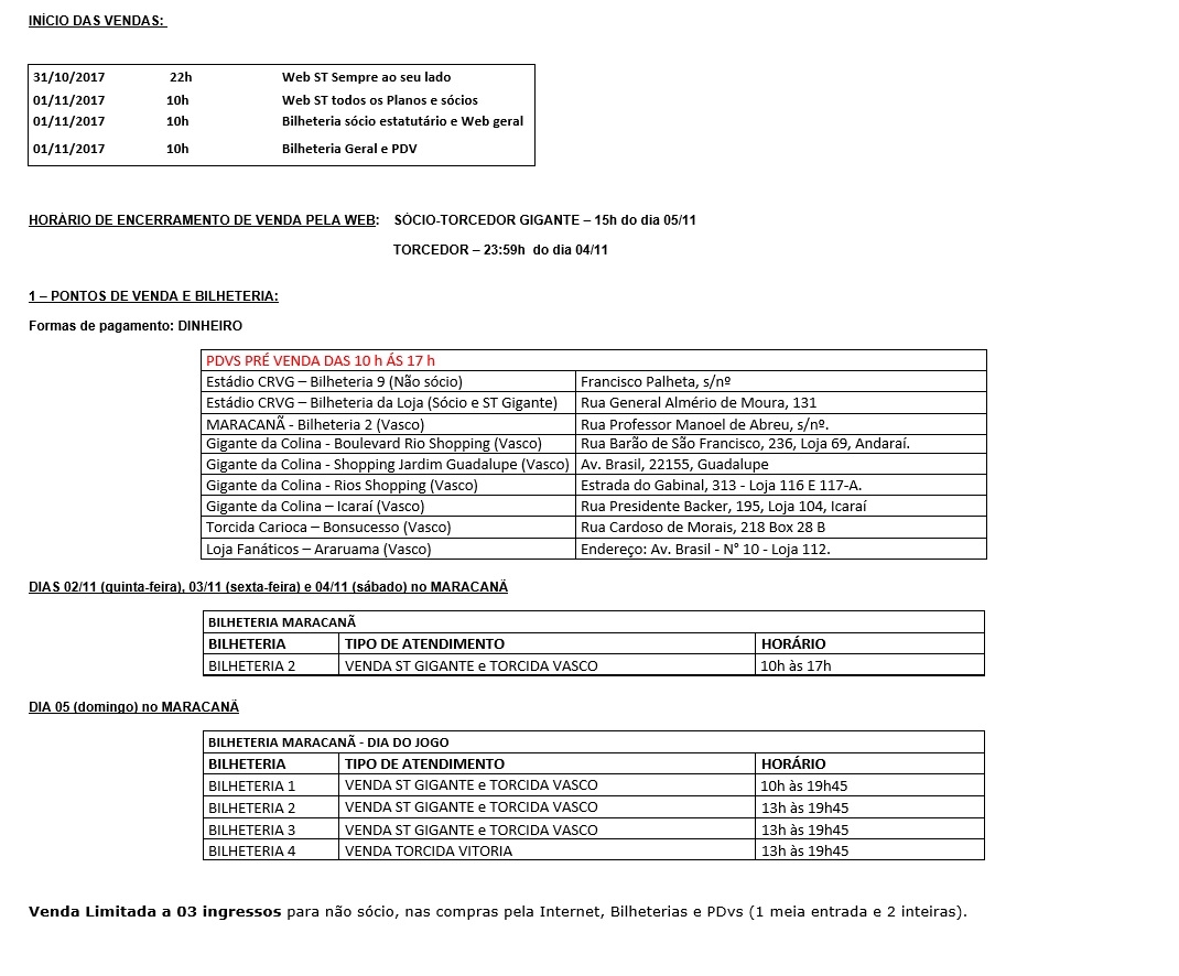 No dia 02/11/2107 (quinta-feira), não haverá venda nem troca de ingressos nas bilheterias de São Januário.