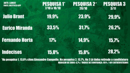 Esta foi a terceira pesquisa realizada pelo Instituto GPP. Julio Brant (chapa Sempre Vasco Livre) aparece com 29,9% das intenções de voto. Em segundo aparece o candidato da situação Eurico Miranda (chapa Reconstruindo o Vasco) com 26,2% das intenções. A margem de erro da pesquisa é de 4,7%. Por conta disso, estatisticamente, Julio Brant e Eurico Miranda ficam tecnicamente empatados.