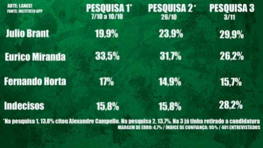 Pesquisa de intenção de voto feita na 6ª-feira coloca Julio Brant com 29,9%, Eurico Miranda com 26,2% e Fernando Horta com 15,7%